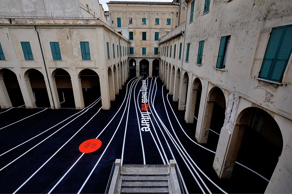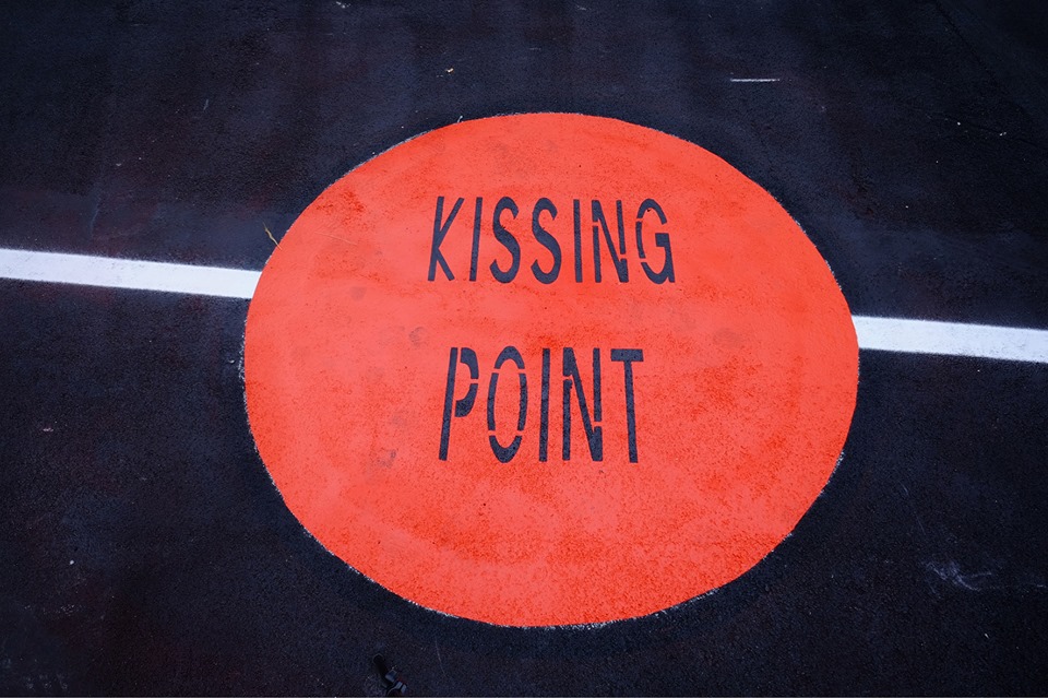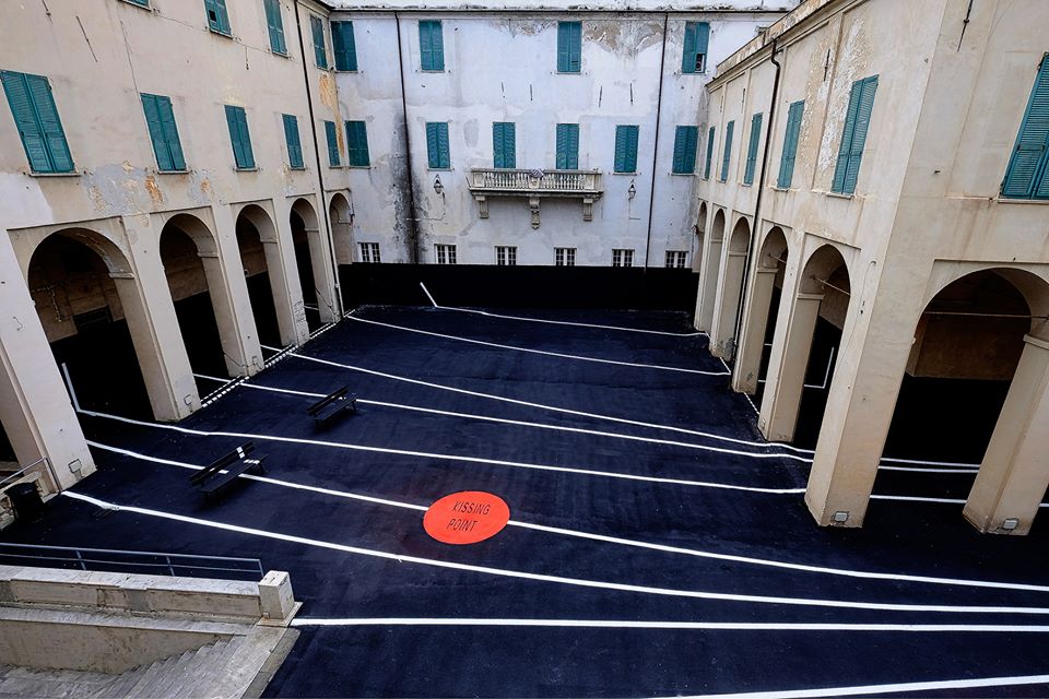 Una serie di linee che partendo dal portale a mare si dirigono verso ogni angolo di Savona interrotte, idealmente, da un punto rosso che riporta una scritta “kissing point”, citazione di tendenza e fenomeno di guerrilla marketing che porta idealmente a riflettere sull’amore verso gli altri e verso la città.